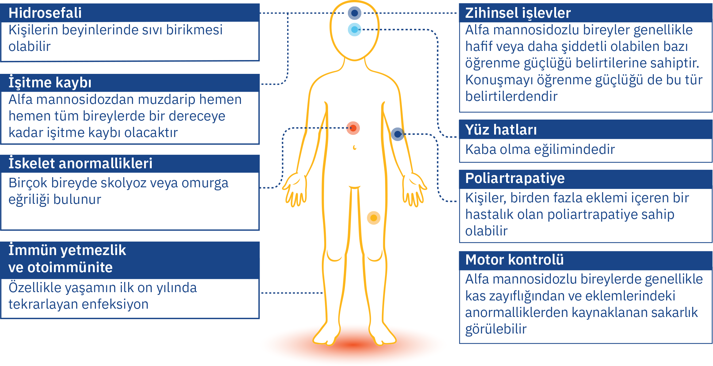 Alfa Mannosidozu olan kişilerde, kısmen parçalanmış şekerler vücutta depolanır ve zamanla birikir. Bu, hücrelerde artan hasara neden olur.2 Bebekler hastalığın çok az belirtisini gösterebilir ancak oligosakkaritlerin birikmesiyle giderek daha fazla hücre zarar gördükçe semptomlar ortaya çıkmaya başlar.3