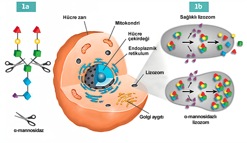 Alfa mannosidaz, lizozomal α-mannosidazı2 kodlayan MAN2B1 (LAMAN) genindeki kalıtsal mutasyonlardan kaynaklanır. Alfa mannosidoz otozomal resesif geçişlidir. MAN2B1 geni 24 ekzondan oluşur ve endoplazmik retikulum2 içinde post-translasyonel olarak modifiye edilen 1011 amino asitlik bir polipeptidi kodlar. MAN2B1’in olgunlaşması ve lizozomlara endozomal taşınması sırasında, proteolitik olarak sırasıyla 70, 42 ve 15 kDa’lık “abc”, “d” ve “e” adlı üç ana polipeptite ayrılır1. Daha spesifik olarak, 70 kDa alt biriminin işlenmesi, toplam beş farklı polipeptit ile sonuçlanır. MAN2B1 ekspresyonunun seviyesi en yüksek akciğer, böbrek, pankreas ve periferik kan lökositlerinde görünüyor1. CNS’de en yüksek ekspresyon seviyesi korpus kallozum ve omurilikte görülürken, serebellum, serebral korteks, frontal ve temporal lobları içeren daha büyük yapılarda oldukça düşük seviyeler gözlenir. Ancak, bu tür varyasyonların önemi (varsa) şu anda net değil1.